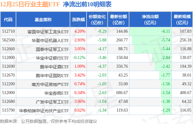 当日有154只行业主题ETF基金出现资金净流出,其中净流出排首位的是富国中证军工龙头ETF(512710),份额减少了8.29亿份,净流出额为6.11亿元。