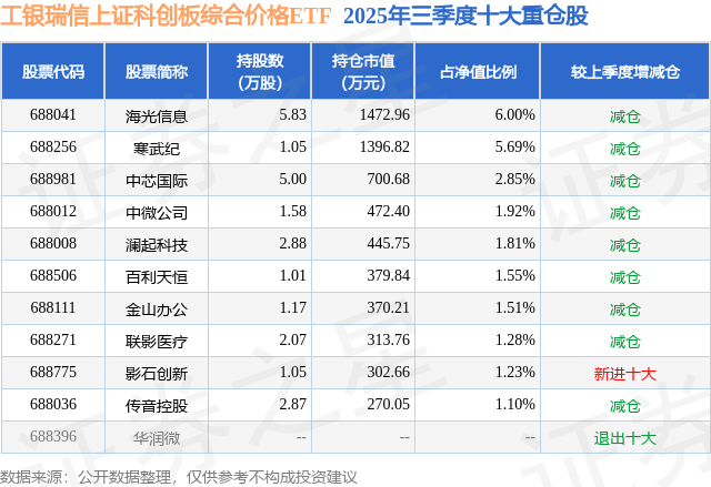 工银瑞信上证科创板综合价格ETF基金成立于2025年2月24日,基金经理为史宝珖,基金跟踪标的为上证科创板综合价格指数,成立以来超额回报为2.67%,近一个月超额回报为0.6%。最新披露的基金持仓数据显示,截止2025年9月30日,该基金第一大重仓股为海光信息(688041),持股占比为6.0%。