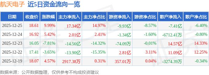 证券之星消息,截至2025年12月25日收盘,航天电子(600879)报收于18.61元,上涨9.99%,涨停,换手率19.47%,成交量642.36万手,成交额115.88亿元。