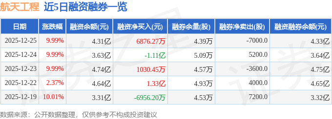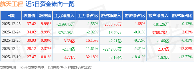 证券之星消息,截至2025年12月25日收盘,航天工程(603698)报收于37.42元,上涨9.99%,已连续涨停3天,换手率7.25%,成交量38.87万手,成交额14.2亿元。