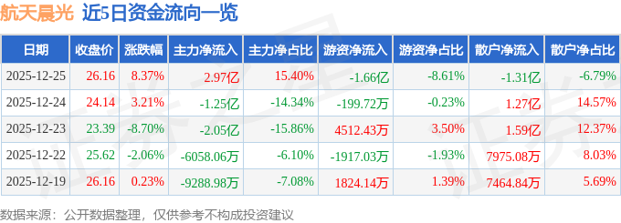 证券之星消息,截至2025年12月25日收盘,航天晨光(600501)报收于26.16元,上涨8.37%,换手率17.28%,成交量73.95万手,成交额19.29亿元。