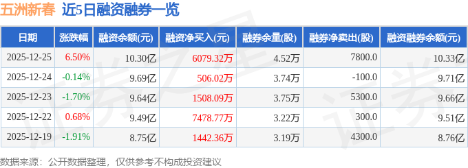 五洲新春融资融券信息显示,融资方面,当日融资买入2.78亿元,融资偿还2.18亿元,融资净买入6079.32万元,连续3日净买入累计8093.43万元。融券方面,融券卖出7800.0股,融券偿还0.0股,融券余量4.52万股,融券余额239.33万元。融资融券余额10.33亿元。