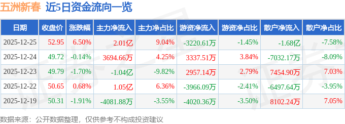证券之星消息,截至2025年12月25日收盘,五洲新春(603667)报收于52.95元,上涨6.5%,换手率11.7%,成交量42.83万手,成交额22.2亿元。