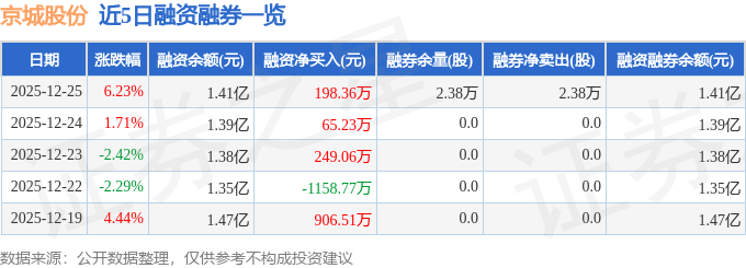京城股份融资融券信息显示,融资方面,当日融资买入2659.73万元,融资偿还2461.38万元,融资净买入198.36万元,连续3日净买入累计512.64万元。融券方面,融券卖出2.38万股,融券偿还0.0股,融券余量2.38万股,融券余额30.01万元。融资融券余额1.41亿元。