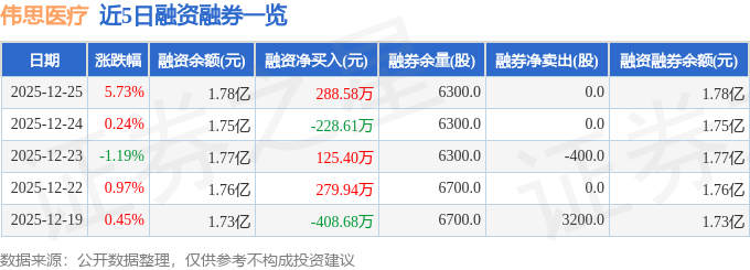 伟思医疗融资融券信息显示,融资方面,当日融资买入2119.11万元,融资偿还1830.53万元,融资净买入288.58万元。融券方面,融券卖出0.0股,融券偿还0.0股,融券余量6300.0股,融券余额31.05万元。融资融券余额1.78亿元。