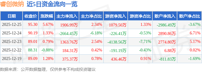 证券之星消息,截至2025年12月25日收盘,睿创微纳(688002)报收于95.3元,上涨5.67%,换手率1.9%,成交量8.76万手,成交额8.15亿元。