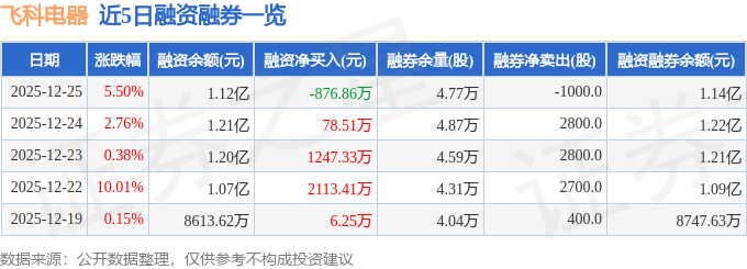 飞科电器融资融券信息显示,融资方面,当日融资买入974.76万元,融资偿还1851.61万元,融资净偿还876.86万元。融券方面,融券卖出400.0股,融券偿还1400.0股,融券余量4.77万股,融券余额189.42万元。融资融券余额1.14亿元。