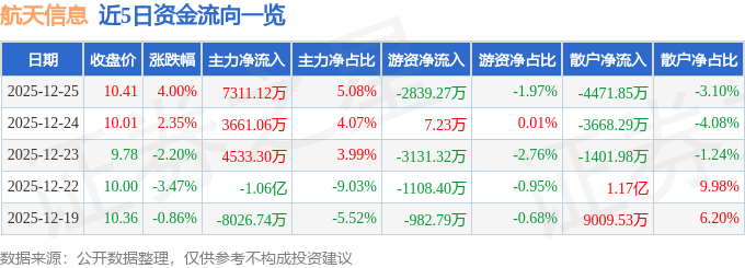 证券之星消息,截至2025年12月25日收盘,航天信息(600271)报收于10.41元,上涨4.0%,换手率7.47%,成交量138.4万手,成交额14.4亿元。