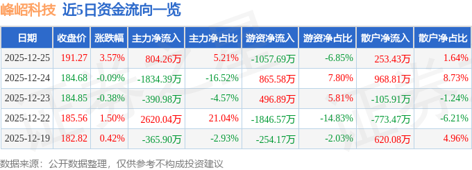 证券之星消息,截至2025年12月25日收盘,峰岹科技(688279)报收于191.27元,上涨3.57%,换手率0.87%,成交量8154.0手,成交额1.54亿元。