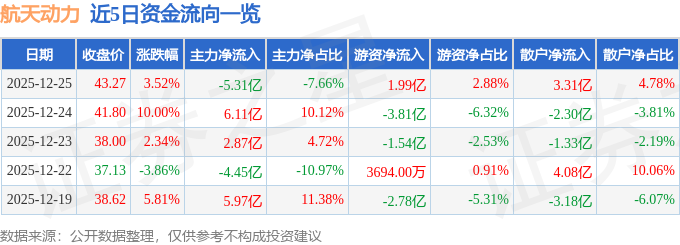 证券之星消息,截至2025年12月25日收盘,航天动力(600343)报收于43.27元,上涨3.52%,换手率25.29%,成交量161.39万手,成交额69.28亿元。