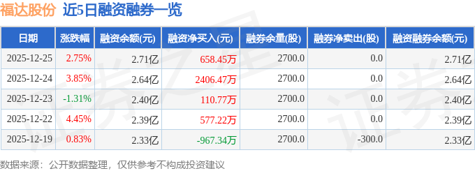 福达股份融资融券信息显示,融资方面,当日融资买入3499.85万元,融资偿还2841.4万元,融资净买入658.45万元,连续3日净买入累计3175.69万元。融券方面,融券卖出0.0股,融券偿还0.0股,融券余量2700.0股,融券余额4.34万元。融资融券余额2.71亿元。