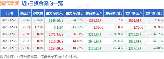 证券之星消息,截至2025年12月25日收盘,海汽集团(603069)报收于27.62元,下跌5.54%,换手率14.64%,成交量46.26万手,成交额13.02亿元。