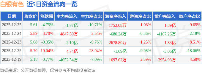 证券之星消息,截至2025年12月25日收盘,白银有色(601212)报收于5.61元,下跌4.75%,换手率4.02%,成交量297.36万手,成交额16.52亿元。