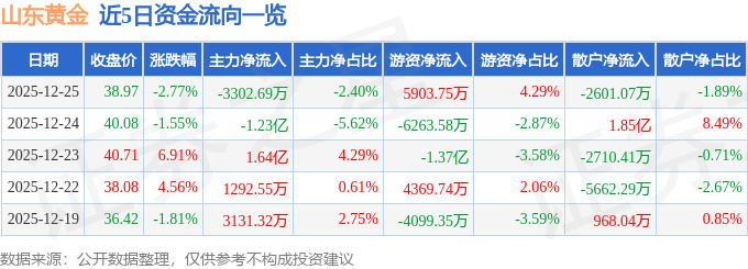 证券之星消息,截至2025年12月25日收盘,山东黄金(600547)报收于38.97元,下跌2.77%,换手率0.98%,成交量35.27万手,成交额13.77亿元。