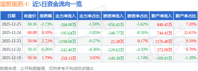 证券之星消息,截至2025年12月25日收盘,迪哲医药(688192)报收于58.36元,下跌2.73%,换手率0.44%,成交量1.99万手,成交额1.17亿元。