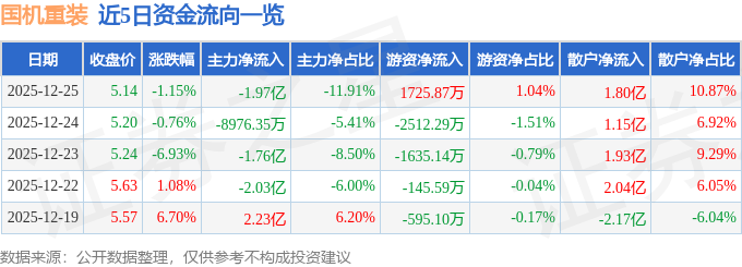 证券之星消息,截至2025年12月25日收盘,国机重装(601399)报收于5.14元,下跌1.15%,换手率4.4%,成交量317.65万手,成交额16.58亿元。