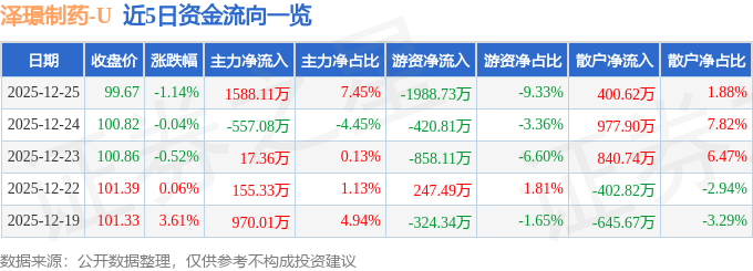 证券之星消息,截至2025年12月25日收盘,泽璟制药(688266)报收于99.67元,下跌1.14%,换手率0.8%,成交量2.12万手,成交额2.13亿元。