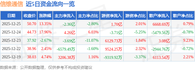证券之星消息,截至2025年12月25日收盘,信维通信(300136)报收于50.7元,上涨13.35%,换手率21.12%,成交量174.12万手,成交额84.42亿元。