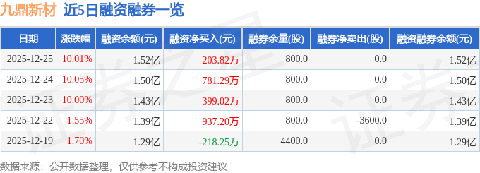 九鼎新材融资融券信息显示,融资方面,当日融资买入939.38万元,融资偿还735.56万元,融资净买入203.82万元,连续3日净买入累计1384.13万元。融券方面,融券卖出0.0股,融券偿还0.0股,融券余量800.0股,融券余额0.91万元。融资融券余额1.52亿元。