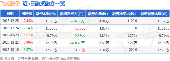 飞龙股份融资融券信息显示,融资方面,当日融资买入6.66亿元,融资偿还6.73亿元,融资净偿还736.55万元。融券方面,融券卖出1100.0股,融券偿还0.0股,融券余量4.91万股,融券余额164.73万元。融资融券余额11.02亿元。