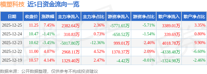证券之星消息,截至2025年12月25日收盘,模塑科技(000700)报收于11.25元,上涨7.45%,换手率9.9%,成交量90.84万手,成交额10.11亿元。