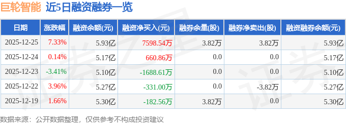巨轮智能融资融券信息显示,融资方面,当日融资买入2.22亿元,融资偿还1.46亿元,融资净买入7598.54万元。融券方面,融券卖出3.82万股,融券偿还0.0股,融券余量3.82万股,融券余额30.22万元。融资融券余额5.93亿元。
