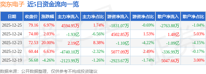 证券之星消息,截至2025年12月25日收盘,奕东电子(301123)报收于79.16元,上涨6.97%,换手率14.93%,成交量34.88万手,成交额26.48亿元。