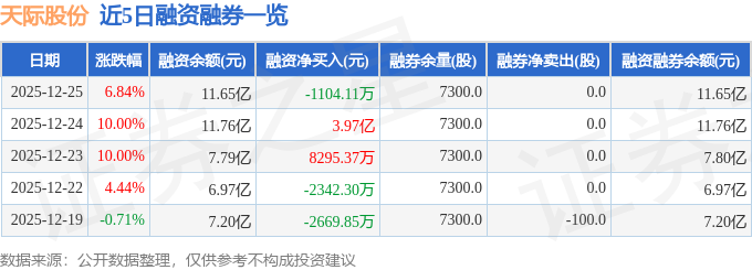 天际股份融资融券信息显示,融资方面,当日融资买入7.34亿元,融资偿还7.45亿元,融资净偿还1104.11万元。融券方面,融券卖出0.0股,融券偿还0.0股,融券余量7300.0股,融券余额32.85万元。融资融券余额11.65亿元。