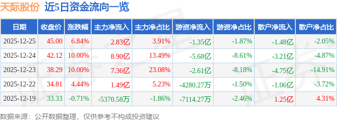 证券之星消息,截至2025年12月25日收盘,天际股份(002759)报收于45.0元,上涨6.84%,换手率34.0%,成交量170.31万手,成交额72.39亿元。