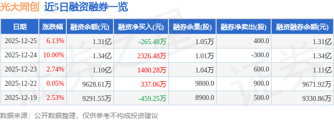 光大同创融资融券信息显示,融资方面,当日融资买入3415.36万元,融资偿还3680.84万元,融资净偿还265.48万元。融券方面,融券卖出400.0股,融券偿还0.0股,融券余量1.05万股,融券余额55.65万元。融资融券余额1.31亿元。