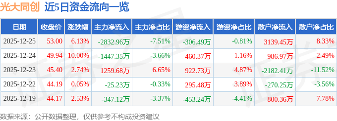 证券之星消息,截至2025年12月25日收盘,光大同创(301387)报收于53.0元,上涨6.13%,换手率16.72%,成交量7.14万手,成交额3.77亿元。