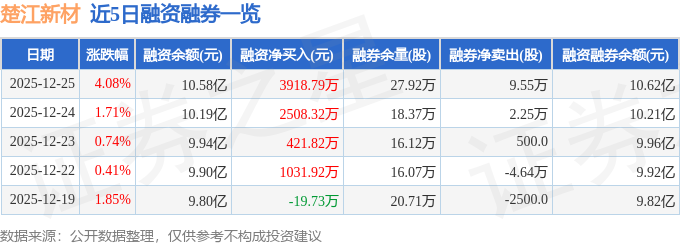 证券之星消息,截至2025年12月25日收盘,楚江新材(002171)报收于13.0元,上涨4.08%,换手率8.95%,成交量144.4万手,成交额18.6亿元。