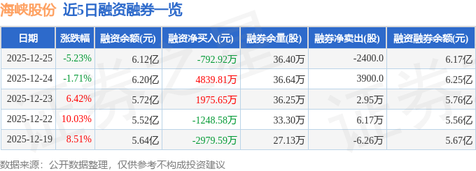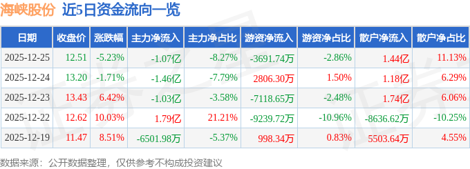 证券之星消息,截至2025年12月25日收盘,海峡股份(002320)报收于12.51元,下跌5.23%,换手率4.53%,成交量101.34万手,成交额12.9亿元。