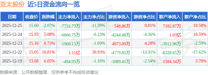 证券之星消息,截至2025年12月25日收盘,亚太股份(002284)报收于15.6元,下跌2.07%,换手率5.89%,成交量43.09万手,成交额6.79亿元。