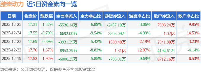 证券之星消息,截至2025年12月25日收盘,潍柴动力(000338)报收于17.31元,下跌1.37%,换手率0.93%,成交量46.29万手,成交额8.03亿元。