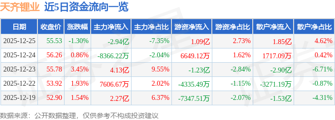 证券之星消息,截至2025年12月25日收盘,天齐锂业(002466)报收于55.53元,下跌1.3%,换手率4.95%,成交量73.03万手,成交额39.95亿元。