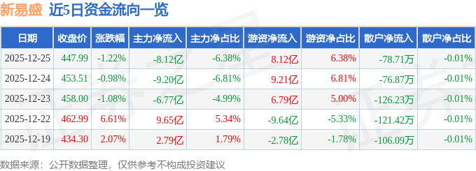 证券之星消息,截至2025年12月25日收盘,新易盛(300502)报收于447.99元,下跌1.22%,换手率3.19%,成交量28.26万手,成交额127.26亿元。