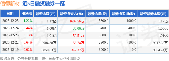 信德新材融资融券信息显示,融资方面,当日融资买入2734.34万元,融资偿还1036.78万元,融资净买入1697.56万元。融券方面,融券卖出1900.0股,融券偿还0.0股,融券余量5300.0股,融券余额25.25万元。融资融券余额1.17亿元。