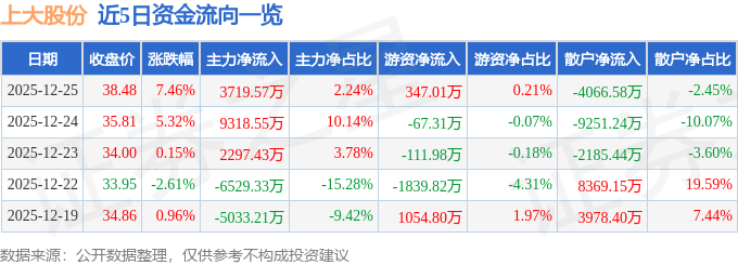 证券之星消息,截至2025年12月25日收盘,上大股份(301522)报收于38.48元,上涨7.46%,换手率15.61%,成交量43.92万手,成交额16.6亿元。