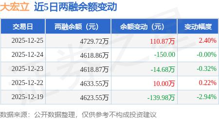证券之星消息,12月25日,大宏立(300865)融资买入391.55万元,融资偿还280.69万元,融资净买入110.87万元,融资余额4729.72万元。