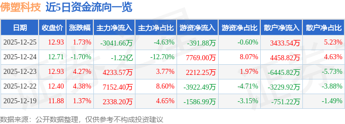 12月25日的资金流向数据方面,主力资金净流出3041.66万元,占总成交额4.63%,游资资金净流出391.88万元,占总成交额0.6%,散户资金净流入3433.54万元,占总成交额5.23%。