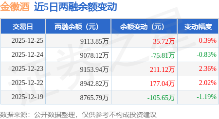 证券之星消息,12月25日,金徽酒(603919)融资买入888.5万元,融资偿还870.81万元,融资净买入17.7万元,融资余额8875.22万元。