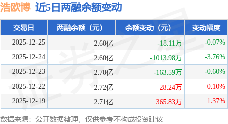 证券之星消息,12月25日,浩欧博(688656)融资买入1468.52万元,融资偿还1486.63万元,融资净卖出18.11万元,融资余额2.6亿元。