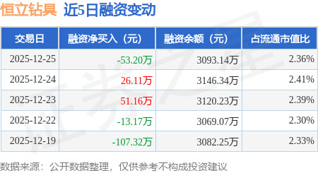 证券之星消息,12月25日,恒立钻具(920942)融资买入301.5万元,融资偿还354.7万元,融资净卖出53.2万元,融资余额3093.14万元。