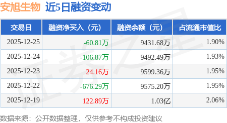 证券之星消息,12月25日,安旭生物(688075)融资买入164.42万元,融资偿还225.23万元,融资净卖出60.81万元,融资余额9431.68万元,近20个交易日中有11个交易日出现融资净买入。