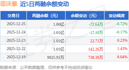 证券之星消息,12月25日,菲沃泰(688371)融资买入564.04万元,融资偿还636.72万元,融资净卖出72.67万元,融资余额9992.67万元。