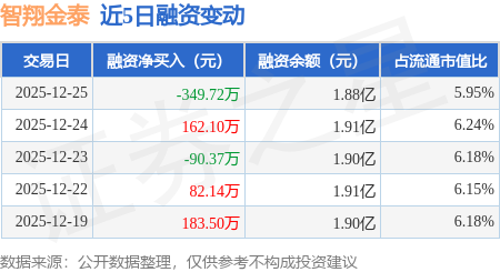 证券之星消息,12月25日,智翔金泰(688443)融资买入439.43万元,融资偿还789.15万元,融资净卖出349.72万元,融资余额1.88亿元。