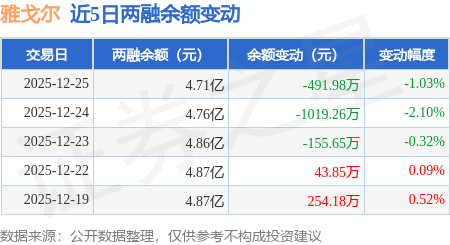 证券之星消息,12月25日,雅戈尔(600177)融资买入1099.91万元,融资偿还1606.75万元,融资净卖出506.84万元,融资余额4.62亿元。