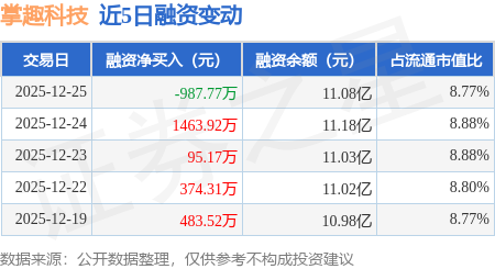 证券之星消息,12月25日,掌趣科技(300315)融资买入2862.02万元,融资偿还3849.79万元,融资净卖出987.77万元,融资余额11.08亿元,近20个交易日中有11个交易日出现融资净买入。