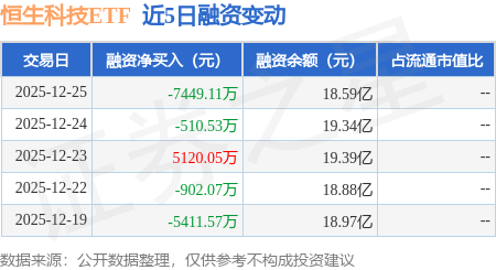 证券之星消息,12月25日,恒生科技ETF(513130)融资买入1.6亿元,融资偿还2.34亿元,融资净卖出7449.11万元,融资余额18.59亿元。